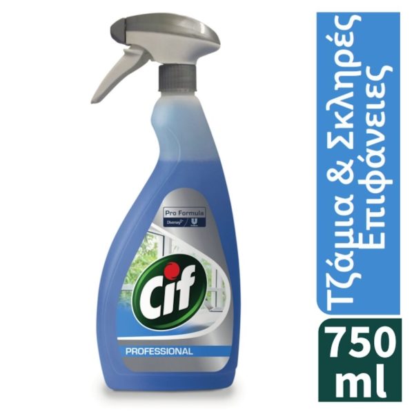 εριγραφή | Το Cif Professional Για Τζάμια & Σκληρές Επιφάνειες απομακρύνει τους ρύπους και τα λίπη αφήνοντας πίσω του ένα αστραφτερό αποτέλεσμα σε λίγα μόλις δευτερόλεπτα. Έτοιμο για χρήση σε παράθυρα και εσωτερικές επιφάνειες, όπως καθρέπτες, τραπέζια και άλλες σκληρές επιφάνειες. |